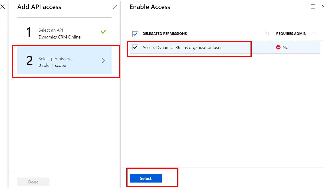 11. It will move to the next step “Select Permissions“, select the “Access Dynamics CRM as organization users” option and click on Select again.