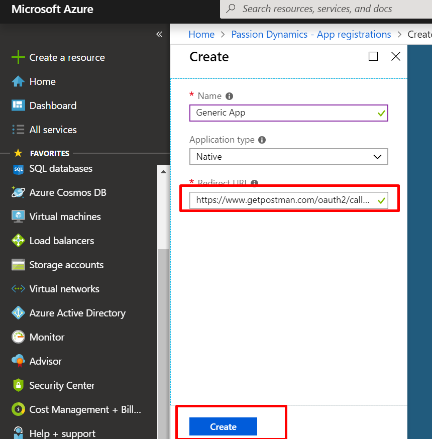 5. In the URL field enter the URL using which you need to obtain the OAuth authentication token in response to the request from that URL ( In my case I am going to use a POSTMAN call back url : https://www.getpostman.com/oauth2/callback ) > click Create: