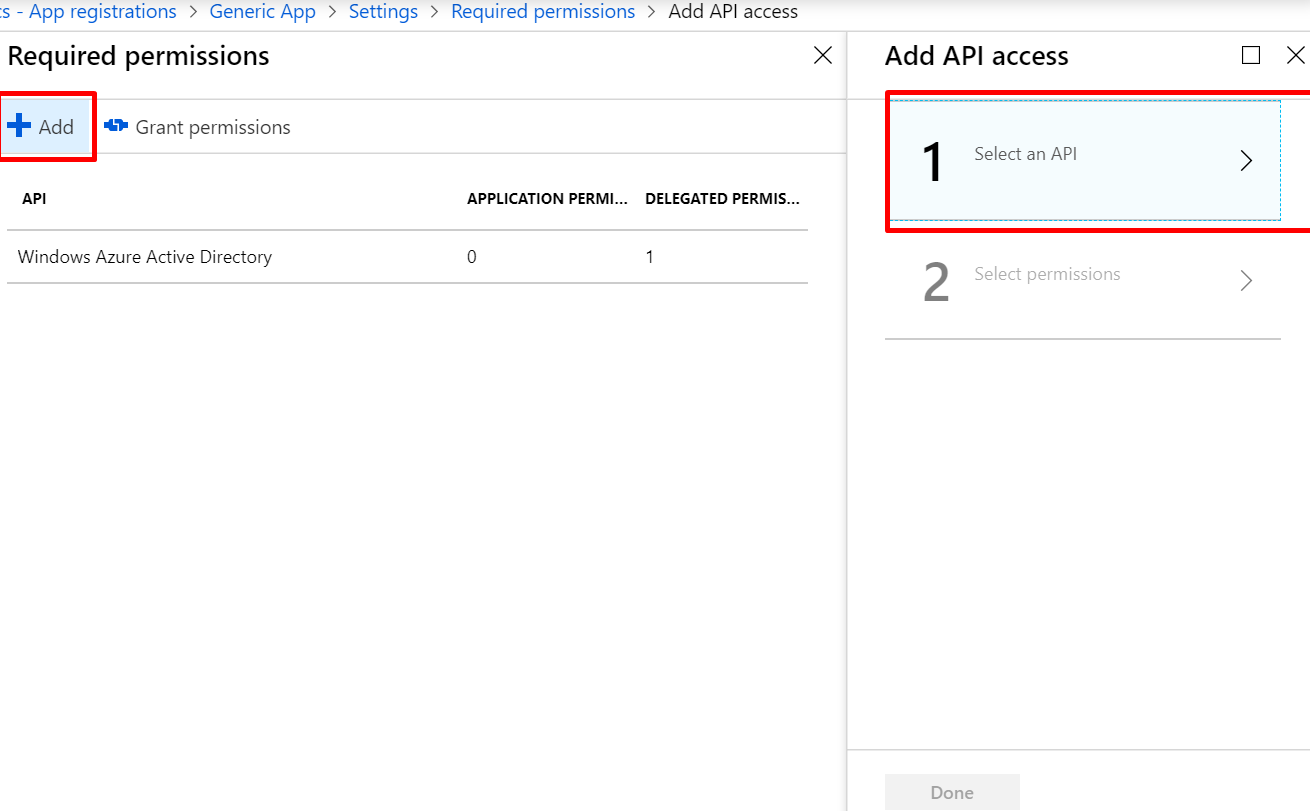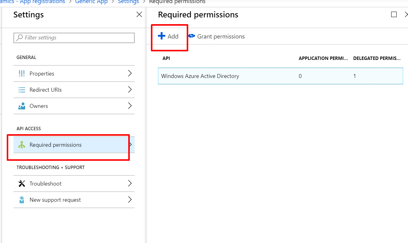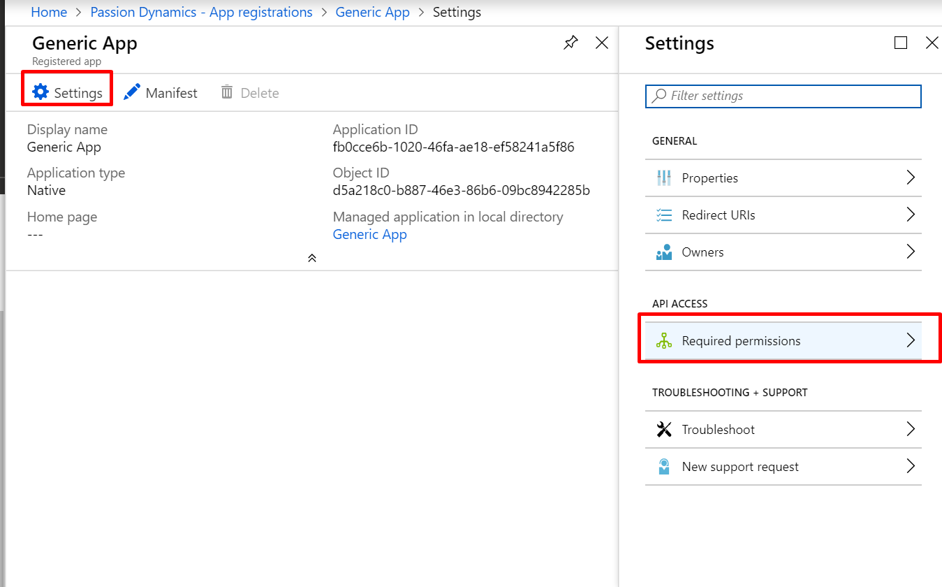 7. Click on the Settings from the application created and then on Required Permissions: